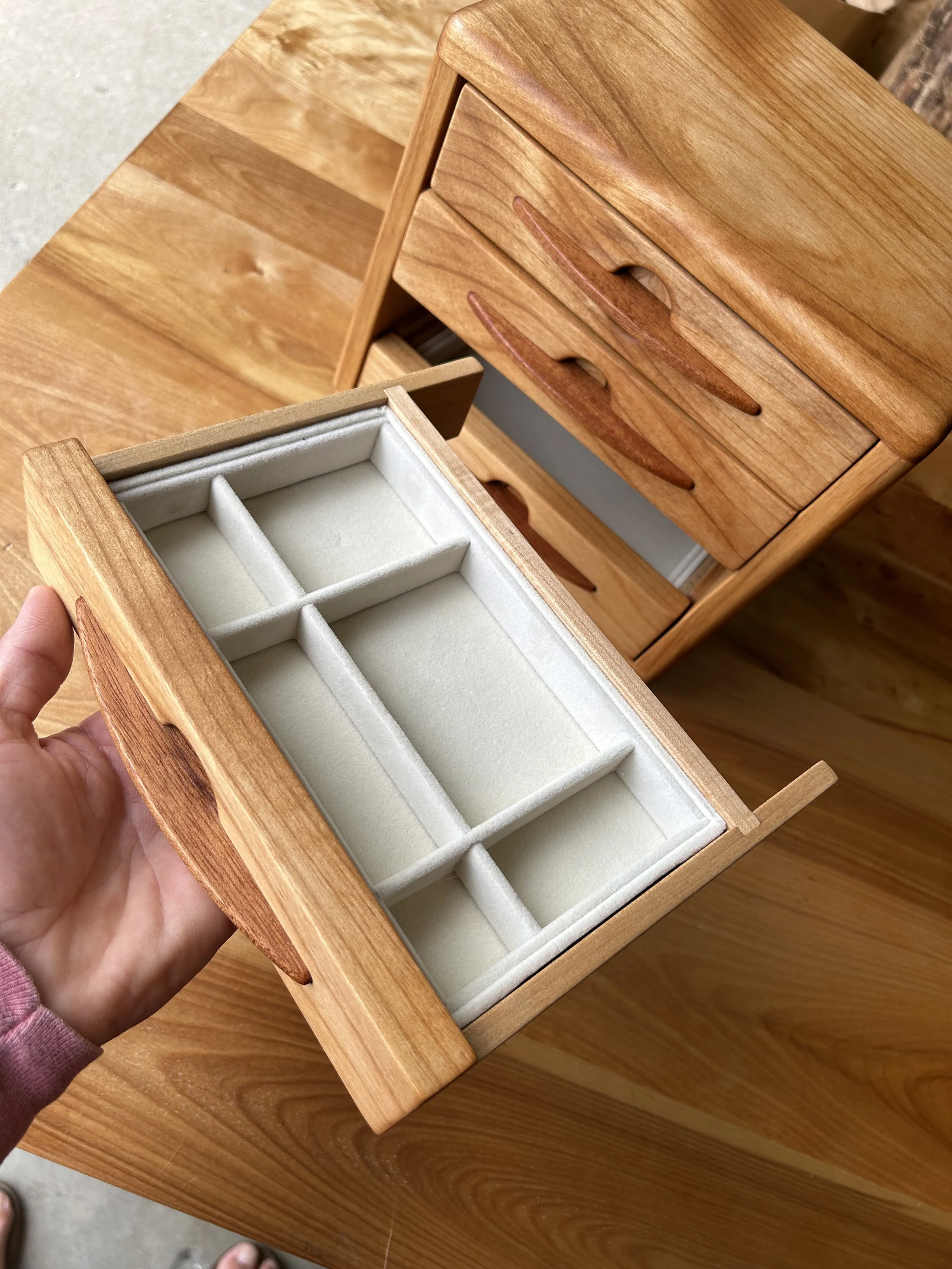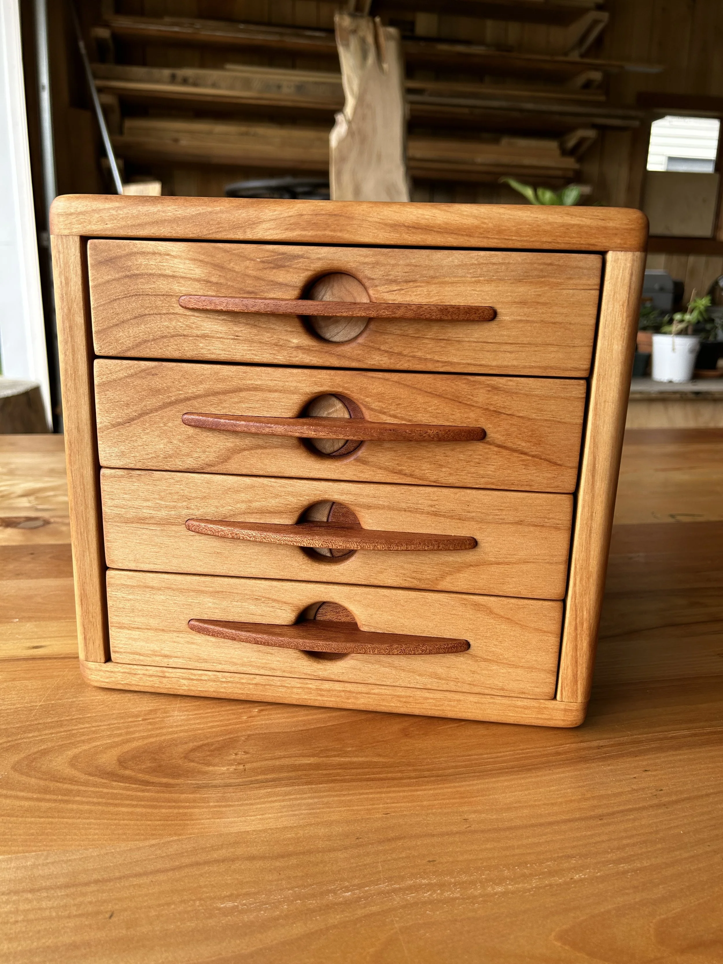 Jewelry box made of alder, mahogany, and maple. Featuring moon phase drawer fronts.
